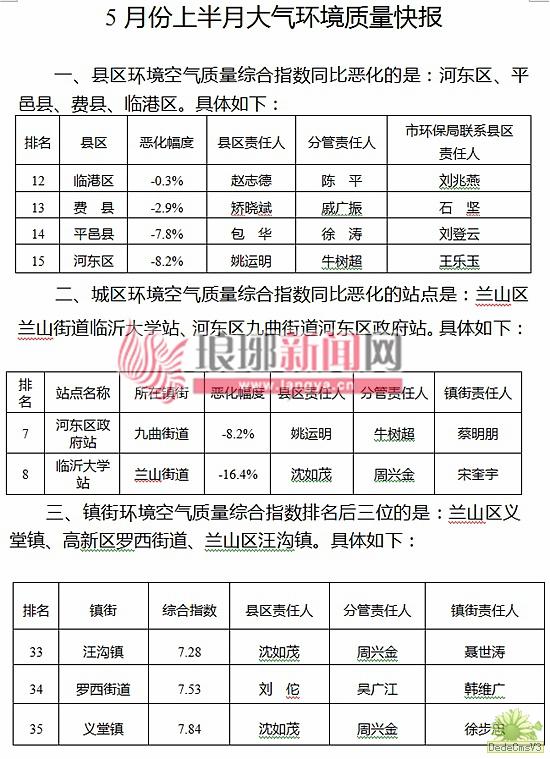 琅琊新闻网5月18日讯(记者 范舜尧)近日,临沂市大气办公布5月份上半月大气环境质量情况,对同比恶化的县区、城区站点,及环境空气质量综合指数排名后三位的镇街予以通报。