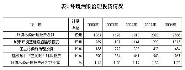 党的十六大以来,各级财政加大了对环境污染防治和生态环境保护的投入,国家还通过各种优惠政策吸引社会资金乃至外资投向环保事业和环保产业,带动了全社会环保投入较快增长。2006年,全国环境污染治理投资总额为2566亿元,比2002年增长87.7%;环境污染治理投资占GDP比重由2002年的 1.14%提高到2006年的1.22%。其中,城市环境基础设施建设投资1315亿元,比2002年增长66.7%,城市燃气、集中供热、园林绿化和市容环境卫生四项投资增长幅度均在75.0%以上;工业污染治理项目完成投资484亿元,比2002年增长1.6倍,治理废水、废气、噪声和其他污染的各项 投资均在1倍以上;实际执行“三同时”项目环保投资767亿元,比2002年增长96.9%(见表2)。2006年营造林固定资产投资479亿元,比 2002年增长60.8%;其中国家投资368亿元,增长48.6%。