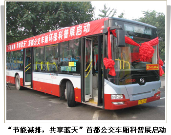 2007年9月15日,“节能减排,共享蓝天”首都公交车厢科普展在全国科普日北京主会场高碑店污水处理厂正式启动。本次活动由国家环保总局科技司、中国 环境科学学会主办,旨在响应中央政府提出的“节能减排”号召,积极参与国家发改委等17个部门组织开展的“节能减排全民行动”,迎接绿色奥运,并在市民中 倡导“节约资源能源,保护生态环境,保障安全健康”的理念。