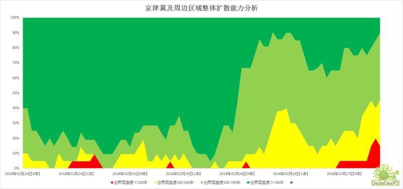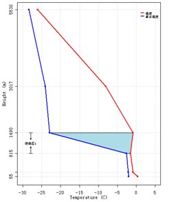 地基雷达观测结果也显示,京津冀及周边地区大气边界层高度从2月25日以来总体持续下降,26日0时到27日0时边界层高度低于700米的区域占比超过60-80%,边界层高度低于500米的区域占比达10-30%,不利于大气污染物扩散(图3)。北京探空资料显示27日8时1400米以下有逆温层,抑制污染物垂直扩散。长时间的小风、高湿叠加逆温等不利气象条件,导致污染不断积累和二次转化(图4)。