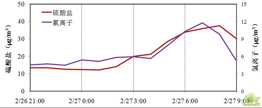 同时,26日夜间北京市PM2.5中硫酸盐组分浓度快速上升,27日早晨硫酸盐质量浓度高达约40微克/立方米,占PM2.5总质量的20%左右,氯离子浓度也呈现同步增长趋势,结合上述分析,指示了区域燃煤污染传输的影响;再叠加本地机动车等污染源排放的累积,北京市PM2.5浓度快速上升,在27日凌晨至上午达到重污染水平(图6)。