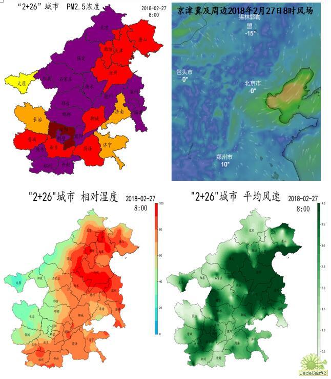 2018年2月26日起,京津冀及周边地区经历了一次重污染过程,主要集中在河北南部、河南北部和山东西北部地区,其中沧州、衡水、邢台、邯郸、安阳等城市污染较严重。截止2月27日8时,京津冀及周边地区“2+26”城市有23个城市PM2.5小时浓度先后超过150微克/立方米(日均值重污染标准);其中,有5个城市PM2.5小时浓度超过250微克/立方米(日均值严重污染标准)。区域内PM2.5小时浓度最高值出现在安阳,2月27日7时达到408微克/立方米;北京市PM2.5小时浓度过程高值同样出现在2月27日7时,达到215微克/立方米(图1)。