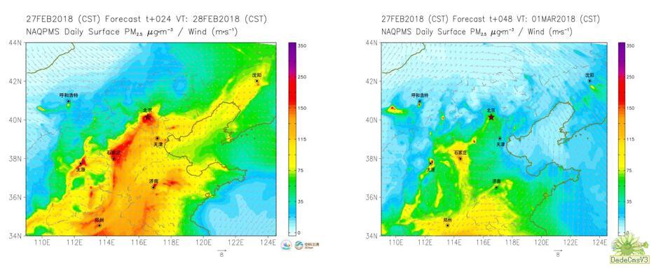 因东北高压系统南下受阻,27日白天冷空气过程显著偏弱,京津冀中部污染过程预计将持续至28日。受区域性弱风、高湿及逆温等不利气象条件影响,京津冀中南部、山西南部、山东西部和河南北部可能出现中至重度污染过程,影响范围主要包括北京、天津、石家庄、保定、衡水、邢台、邯郸、晋城、济南、德州、淄博、聊城、郑州、安阳、鹤壁、焦作、新乡、濮阳等城市,部分城市可能达到严重污染,PM2.5小时浓度峰值可能达到或超过350微克/立方米。28日夜间至3月1日凌晨,受冷空气过程影响,包括北京、天津在内的京津冀中部城市群空气质量有望改善(图9)。