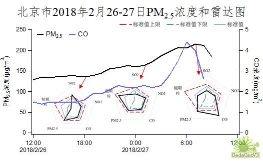 图5 北京市2月26-27日雷达图及东部通道CO浓度变化