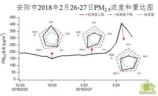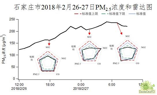 图7 石家庄、安阳2月26-27日PM2.5浓度和雷达图