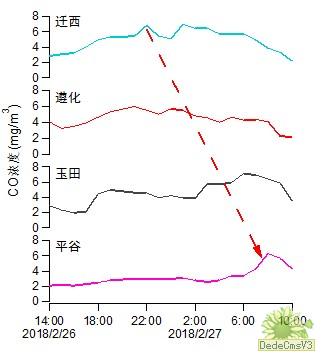 本次重污染过程中,从唐山到北京一线的CO浓度伴随PM2.5存在明显的快速增加,北京2月27日4时之前CO维持在2.2-2.3 mg/m3,5-9时迅速上升至2.6-4.4 mg/m3。从迁西-遵化-玉田-平谷(沿主导风向)各监测点位的时序变化也可以看出,CO沿传输方向峰值明显呈依次出现的特征。污染物特征雷达图也显示,北京在此次污染过程中CO呈现相对很高的特征。以上证据表明,北京市的污染明显受到了来自东部地区的传输影响(图5)。