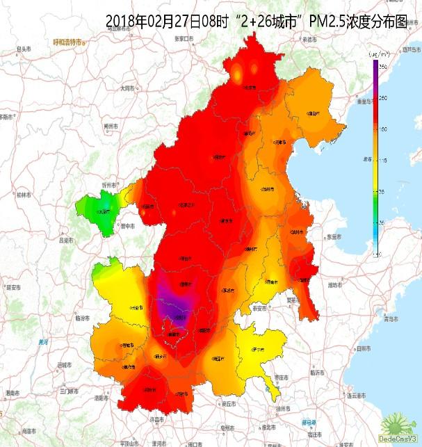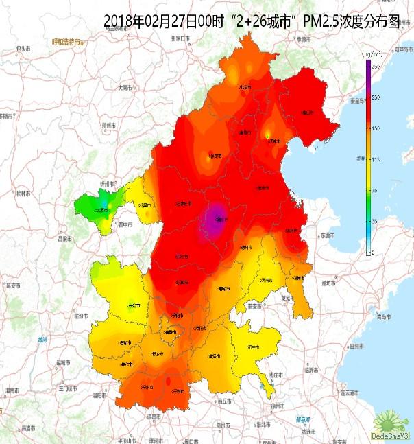 图1 “2+26”城市2月27日PM2.5浓度分布图