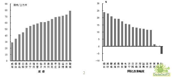 可吸入颗粒物浓度最好的是威海市,为29μg/m3,最差的是聊城市,为79μg/m315市同比改善,改善幅度最大的是烟台市,为23.9%;青岛市同比持平;临沂市同比恶化,为5.2%。