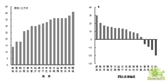 二氧化硫浓度最好的是威海和聊城市,为6μg/m3,最差的是莱芜市,为19μg/m317市均同比改善,改善幅度最大的是淄博市,为54.3%。