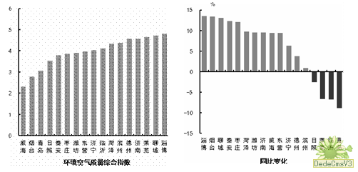 环境空气质量综合指数最好的城市是威海市,为2.30,最差的城市是淄博市,为4.80。13市同比改善,改善幅度最大的城市是淄博市,为13.5%;4市同比恶化,恶化幅度最大的城市是青岛市,为8.9%。