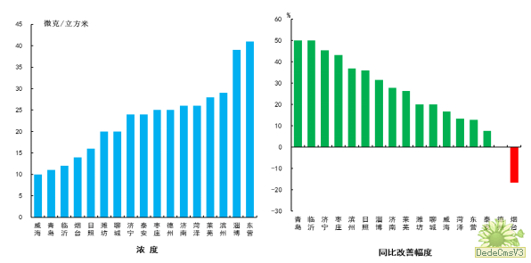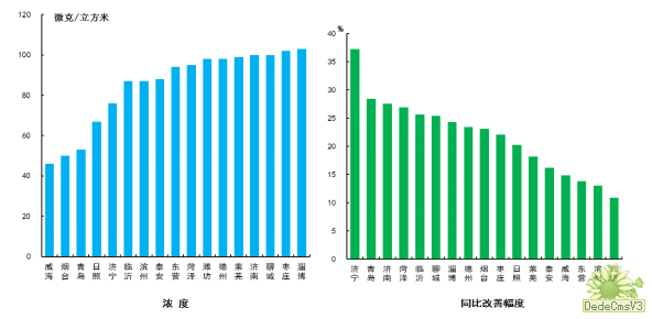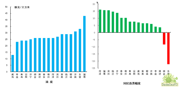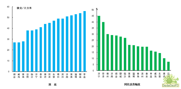细颗粒物浓度最好的城市是烟台市和威海市,为27μg/m3,最差的城市是枣庄市,为56μg/m3;同比改善幅度最大的是济宁市,为45.1%。