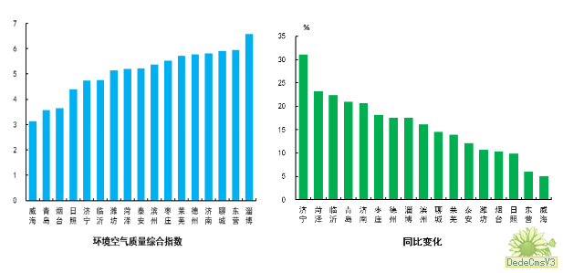 环境空气质量综合指数最好的城市是威海市,为3.14,最差的城市是淄博市,为6.57;同比改善幅度最大的城市是济宁市,为31.1%。