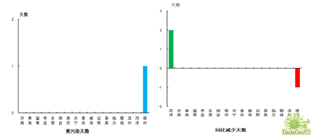德州市出现重污染天气,为1天。菏泽市重污染天数同比减少,为2天;德州市重污染天数同比增多,为1天;其余15市同比持平。