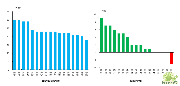 “蓝天白云,繁星闪烁”天数最多的城市是烟台市和威海市,为30天,最少的是聊城市,为18天。“蓝天白云,繁星闪烁”天数同比增加最多的是滨州市,为9天;青岛、烟台、威海、菏泽等4市同比持平;潍坊市同比减少,为3天。