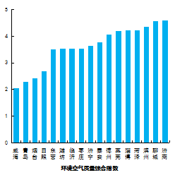 环境空气质量综合指数最好的城市是威海市,为2.06,最差的城市是济南市,为4.59。17市均同比下降,下降幅度最大的城市是青岛市,为37.2%。