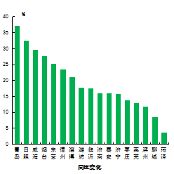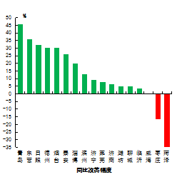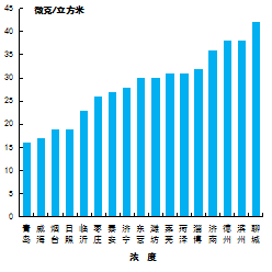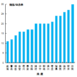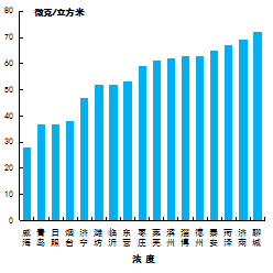 细颗粒物浓度最好的城市是青岛市,为16μg/m3,最差的城市是聊城市,为42μg/m3。17市均同比下降,下降幅度最大的城市是日照市,为47.2%。
