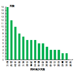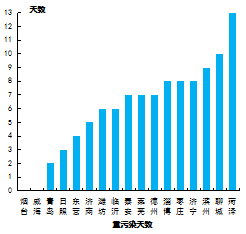 重污染天数最少的城市是烟台和威海市,未出现重污染天气;最多的城市是菏泽市,为13天。16市同比减少,减少幅度最大的城市是德州市,为16天;威海市同比持平。