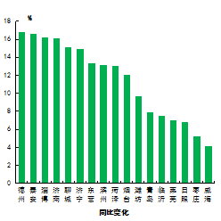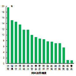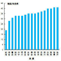 细颗粒物浓度最好的城市是威海市,为31μg/m3,最差的城市是枣庄市,为68μg/m3。17市均同比下降,下降幅度最大的城市是济南市,为23.6%。