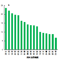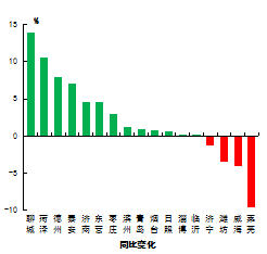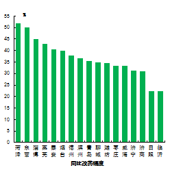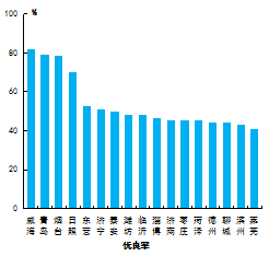 优良率最好的城市是威海市,为81.8%,最差的城市是莱芜市,为40.8%。13市同比增加,增加幅度最大的城市是聊城市,为13.9个百分点;4市同比减少,减少幅度最大的城市是莱芜市,为9.5个百分点。