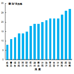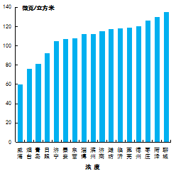 可吸入颗粒物浓度最好的城市是威海市,为60μg/m3,最差的城市是聊城市,为135μg/m3。17市均同比下降,下降幅度最大的城市是济南市,为19.6%。