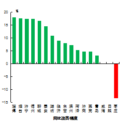 二氧化氮浓度最好的城市是威海市,为19μg/m3,最差的城市是淄博和临沂市,为41μg/m3。14市同比下降,下降幅度最大的城市是淄博市,为18.0%;威海和日照市同比持平;枣庄市同比上升,上升幅度为13.3%。