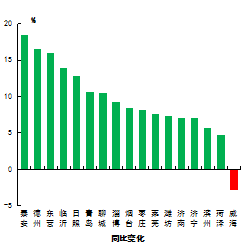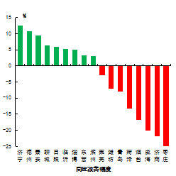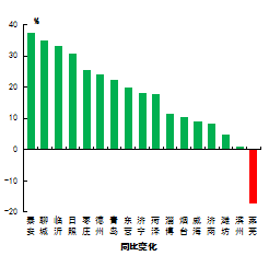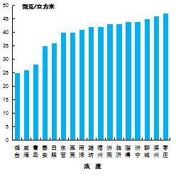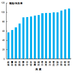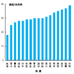 细颗粒物浓度最好的是烟台市,为25μg/m3,最差的是枣庄市,为47μg/m3。15市同比下降,下降幅度最大的是泰安市,为18.6%;青岛市同比持平;威海市同比上升,上升幅度为8.3%。