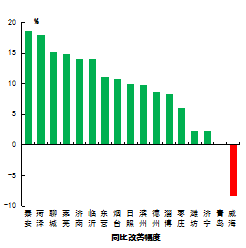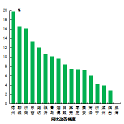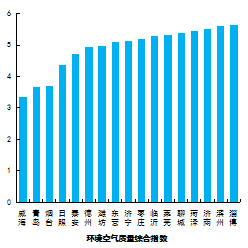 环境空气质量综合指数最好的是威海市,为3.35,最差的是淄博市,为5.63。16市同比下降,下降幅度最大的是泰安市,为18.4%;威海市同比上升,上升幅度为2.8%。