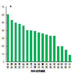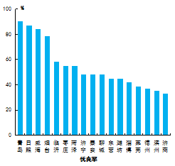 优良率最好的是青岛市,为90.3%,最差的是济南市,为33.3%。16市同比增加,增加幅度最大的是泰安市,为37.3个百分点;莱芜市同比减少,减少幅度为17.3个百分点。