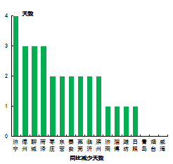 7市均未出现重污染天气。14市同比减少,减少幅度最大的是济宁市,为4天;青岛等3市同比持平。
