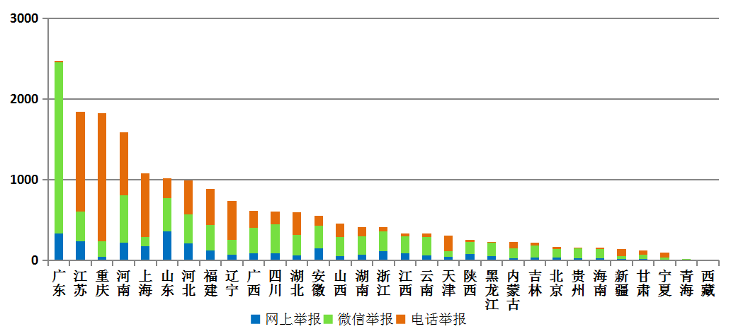 从各地区不同渠道举报数量看,重庆、江苏电话举报量较多,广东微信举报占比超过85%。