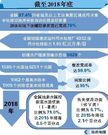 监测数据显示,2018年,全国地表水国控断面水质优良(Ⅰ-Ⅲ类)、丧失使用功能(劣Ⅴ类)比例分别为71.0%、6.7%,分别比2015年提高6.5个百分点、降低2.1个百分点,水质稳步改善。但是,水污染防治形势依然严峻,在城乡环境基础设施建设、氮磷等营养物质控制、流域水生态保护等方面还存在一些突出问题,需要加快推动解决。