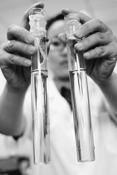 七月四日,江苏沭阳县疾病预防控制中心的工作人员对地面水厂的出厂水水样进行检测。当日,沭阳地面水厂出厂水的水质检测结果显示,十三项主要监测指标基本达标。 新华社记者 韩瑜庆 摄