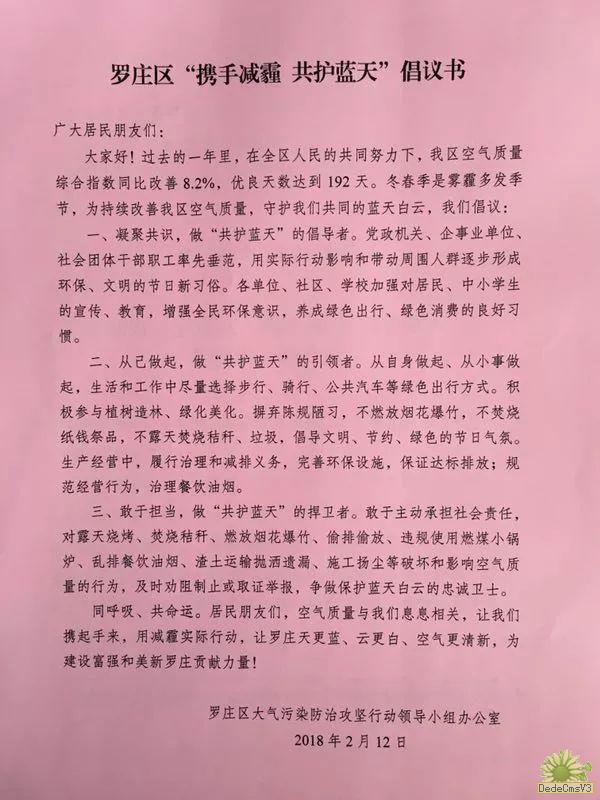 临近2018年的春节,喜庆祥和的气氛依然很浓厚,可是我们也不要忘记了“雾霾”。尤其是在除夕夜我们要提倡大家清洁欢庆春节。为引导全区广大干部群众积极参与大气污染防治攻坚行动,掀起全民共治的良好氛围,罗庄环境特此发布《罗庄区“携手减霾 共护蓝天”倡议书》,并通过微博@罗庄环境、微信公众号“罗庄环境”、传单张贴发放等方式公布。各街道、各部门,将倡议书发至全体干部、职工和所辖社区。呼吁大家环保过节,保护生态环境,保护清洁的空气。