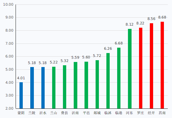 1-12月,省控以上地表水考核断面水环境质量最佳的3个县区依次为蒙阴县、兰陵县、沂水县,最差的3个县区依次为莒南县、经开区、罗庄区。