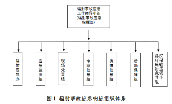 局辐射事故应急工作领导小组下设辐射事故应急办公室(简称辐射应急办)、应急监测组、现场处置组、专家咨询组、舆情信息组、后勤保障组以及各县区环保部门辐射应急工作领导小组。辐射事故应急响应组织体系如图1所示。