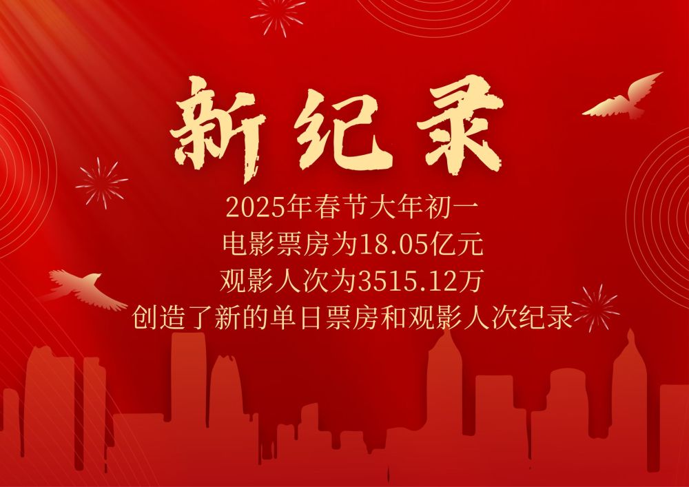 新华社记者从国家电影局获悉,2025年春节大年初一(1月29日)票房为18.05亿元,观影人次为3515.12万,均超过2021年春节大年初一,创造了新的单日票房和观影人次纪录。