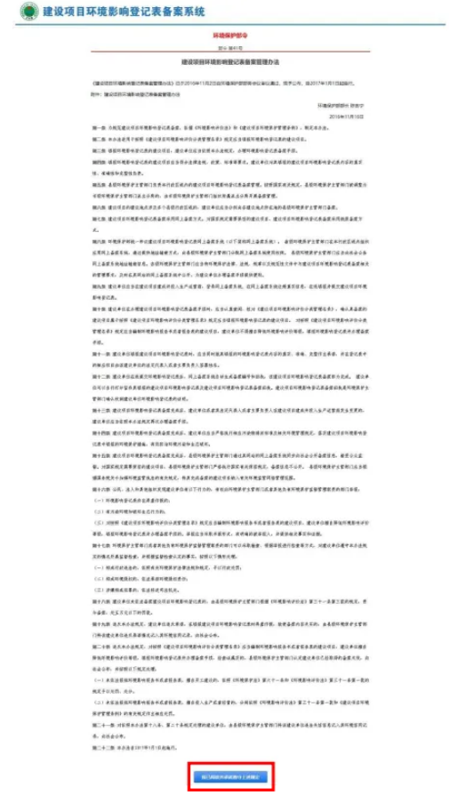 2. 点击“备案系统”向导页中“继续”,进入填报指南页,请仔细阅读《建设项目环境影响登记表备案管理办法》,再点击“我已阅读并承诺遵守上述规定”(详见图3),进入登录页(详见图4)。