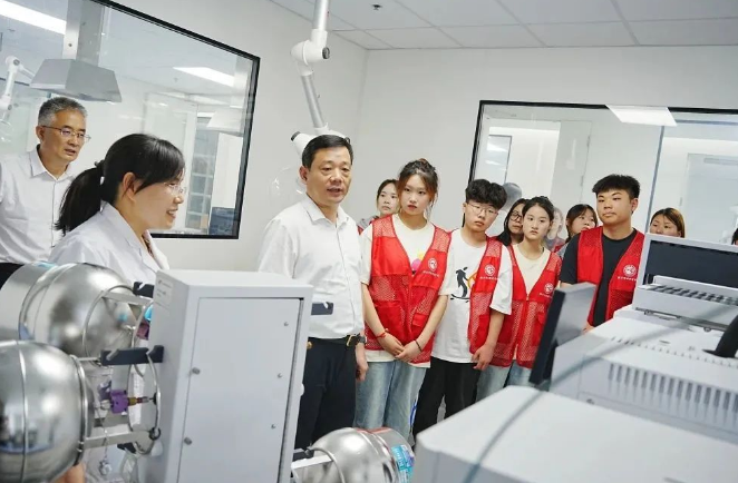 随后,王鑫局长带着同学们来到分析实验室,先后参观了重金属分析、有机物分析、常规项目分析等10余间实验室,听取了设备的工作原理、分析项目、实验精度、分析频次等内容的介绍。各种高精尖仪器设备让人印象深刻,让大家对环境监测工作有了直观印象。参观有机物分析实验室时,同学们对气相色谱质谱仪、液相色谱仪等大型监测设备表现出浓厚的兴趣,同学们说,有机会走近这些实验室,看到这些科学仪器真是大开眼界、受益匪浅。